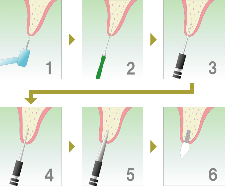 当院のインプラント治療は、骨の表面に小さな穴をあけ、その穴を少しずつ広げながらインプラントを入れる「大口式インプラント」採用しております。ドリルを使用せず骨も削らないので、安全かつ少なくなっている骨を無駄にしません。